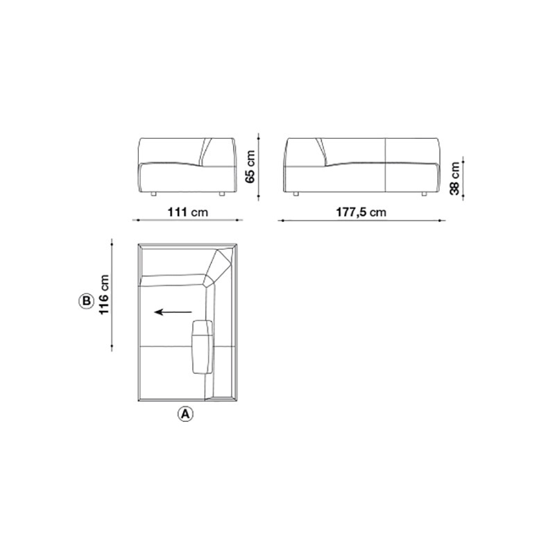Bedingt durch das wellenförmige Design besitzen die BEND Elemente an den Seiten zwei verschiedene Tiefen, die durch A (= 111 cm) und B (= 116 cm) in den technischen Zeichungen gekennzeichnet sind. Für eine individuelle Sofa-Zusammenstellung beachten Sie bitte, dass nur Elemente mit gleichem Seitenmaß nebeneinander gestellt werden können (Seite A an Seite A oder Seite B an Seite B):