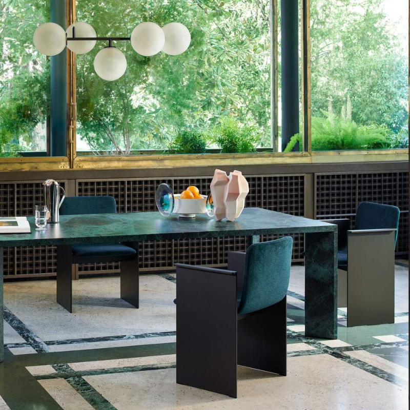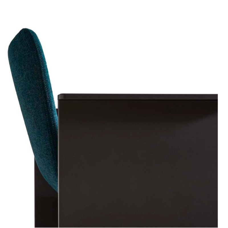 Sitzschale aus Sperrholz mit einer Verbindungsplatte aus schwarz lackiertem Stahl