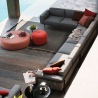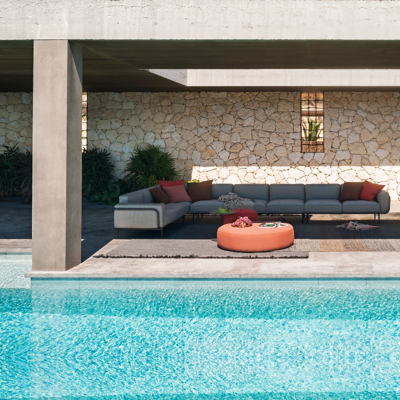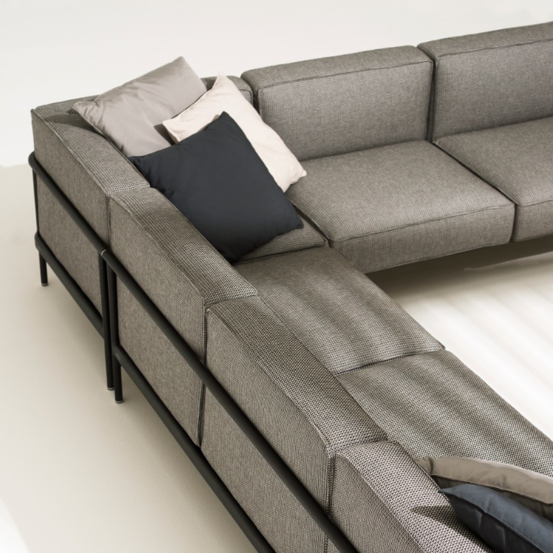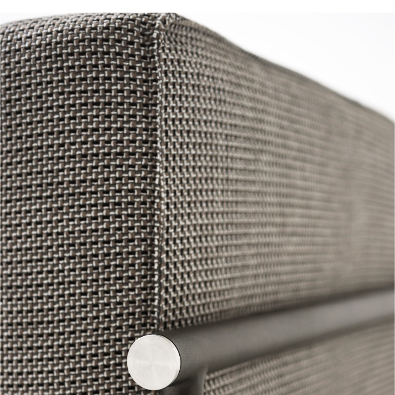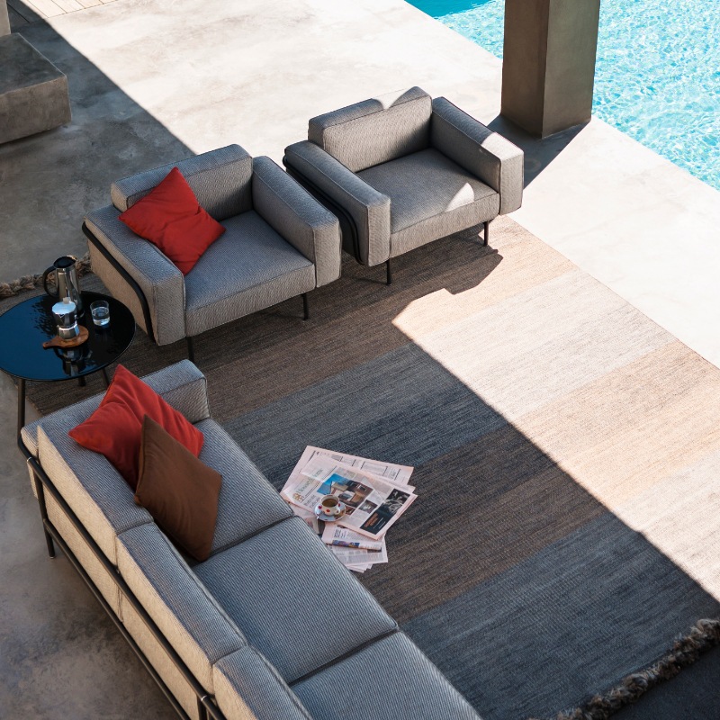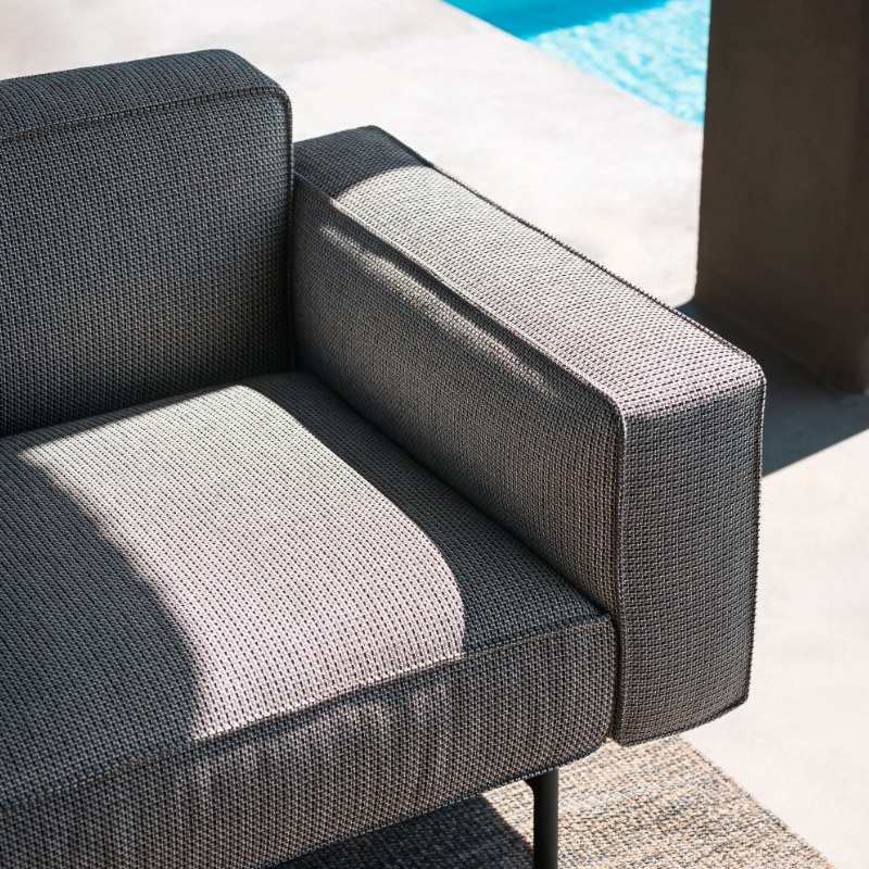 Polster mit Bezügen in verschiedenen Farb-Varianten, wetterbeständige Hydrodränage-Ausführung.