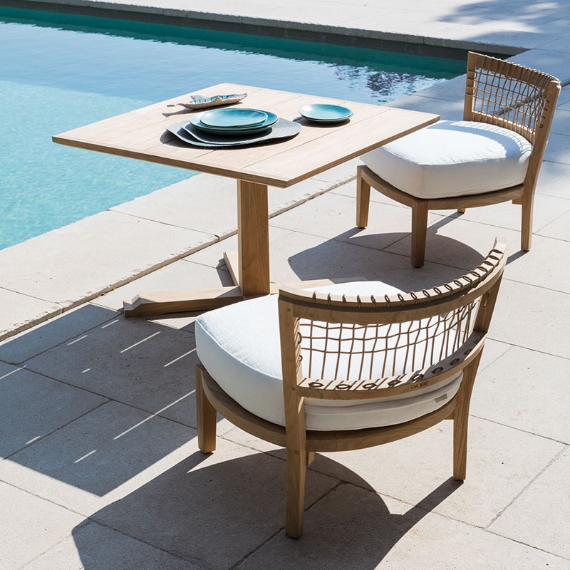 Das robuste und elegante Teakholz mit seinen warmen Farbnuancen ist ideal für die Verwendung im Outdoorbereich geeignet. Es ist von Natur aus reich an Mineralsalzen und Ölen und dadurch besonders widerstandsfähig gegen Schädlinge und Witterungseinflüsse wie Sonne, Regen und Salz.