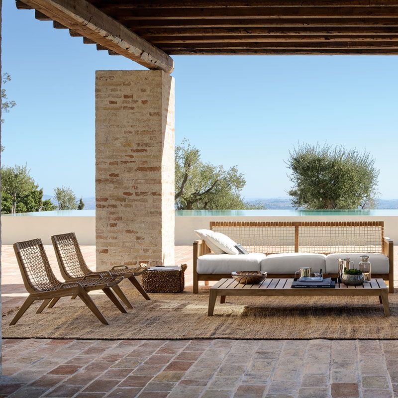 Das robuste und elegante Teakholz mit seinen warmen Farbnuancen ist ideal für die Verwendung im Outdoorbereich geeignet. Es ist von Natur aus reich an Mineralsalzen und Ölen und dadurch besonders widerstandsfähig gegen Schädlinge und Witterungseinflüsse wie Sonne, Regen und Salz.