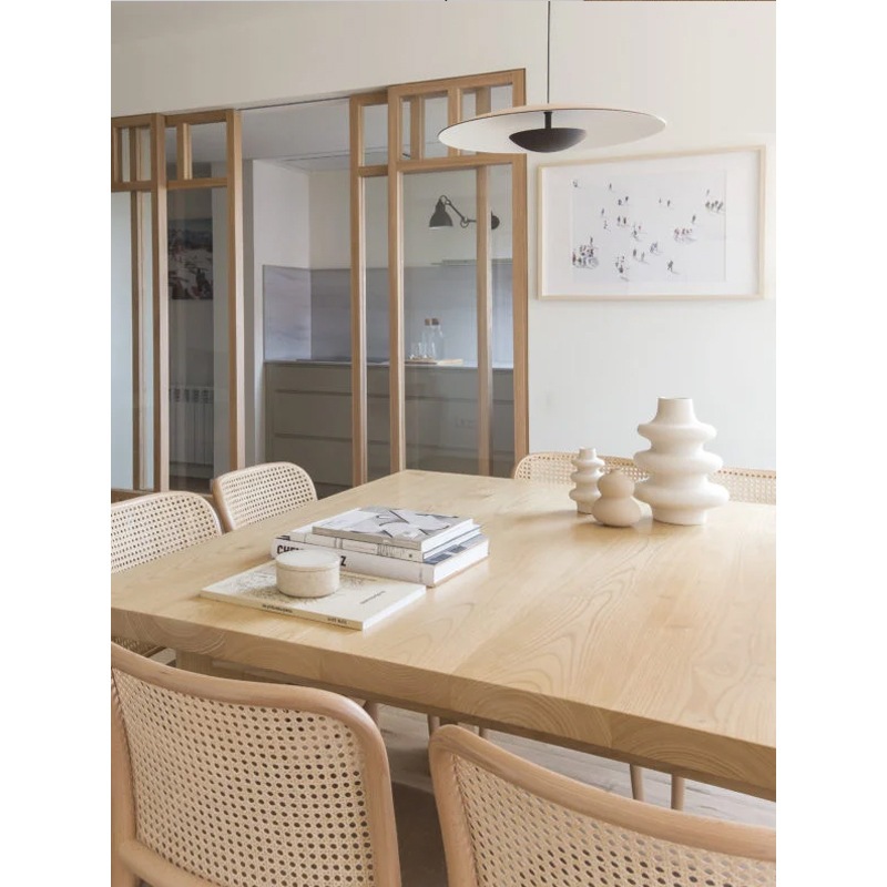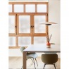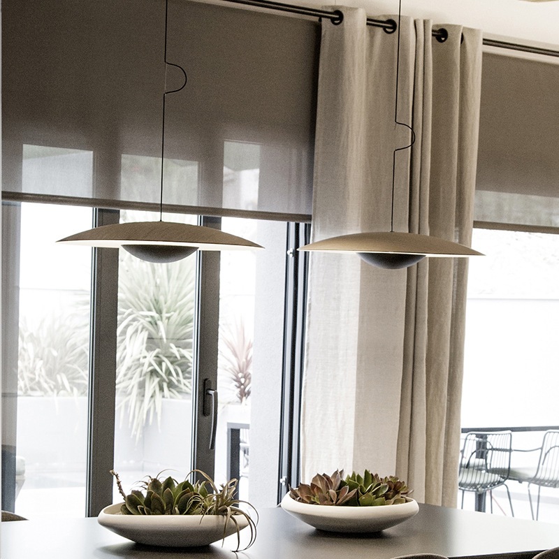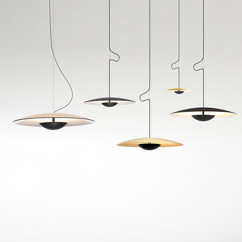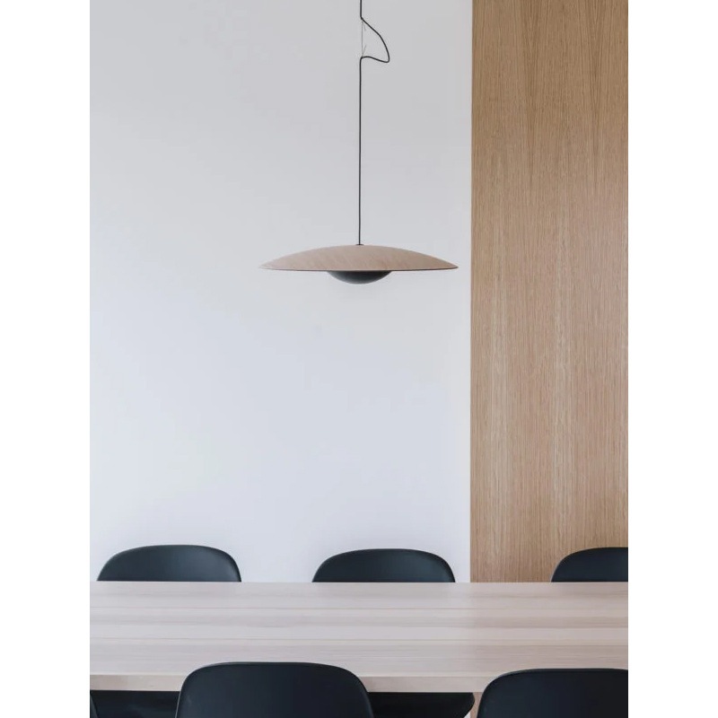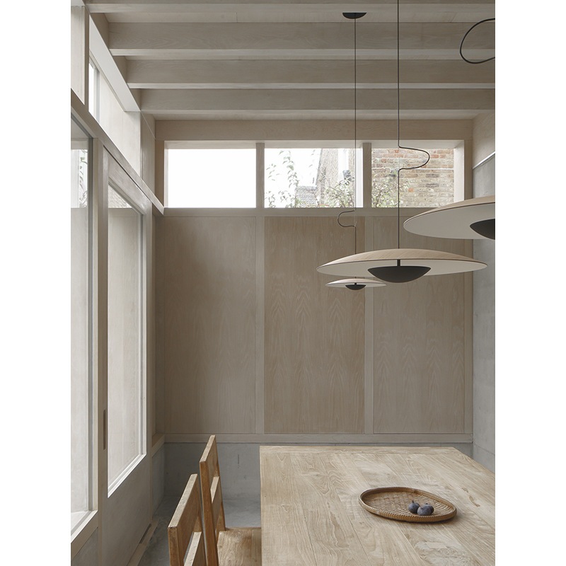 Die Kombination von dünnen Holzschichten und Papier, die mit einem Kunstharz unter Druck und Hitze in Form gepresst werden, schafft einen beinahe zweidimensionalen Lichtkörper, der mit seiner Schlichtheit indirektes Licht wirft und den Raum erhellt.