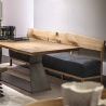 Bank mit Massivholz-Struktur, gepolsterter Sitzfläche und durchgehender Rückenlehne aus Massivholz mit naturbelassener Oberkante. Die Polsterbezüge sind mit sichtbaren Deko-Nähten versehen und sowohl in verschiedenen Leder- als auch Stoff-Ausführungen erhältlich.