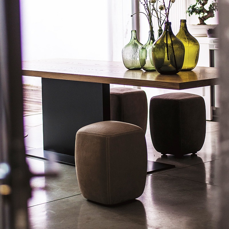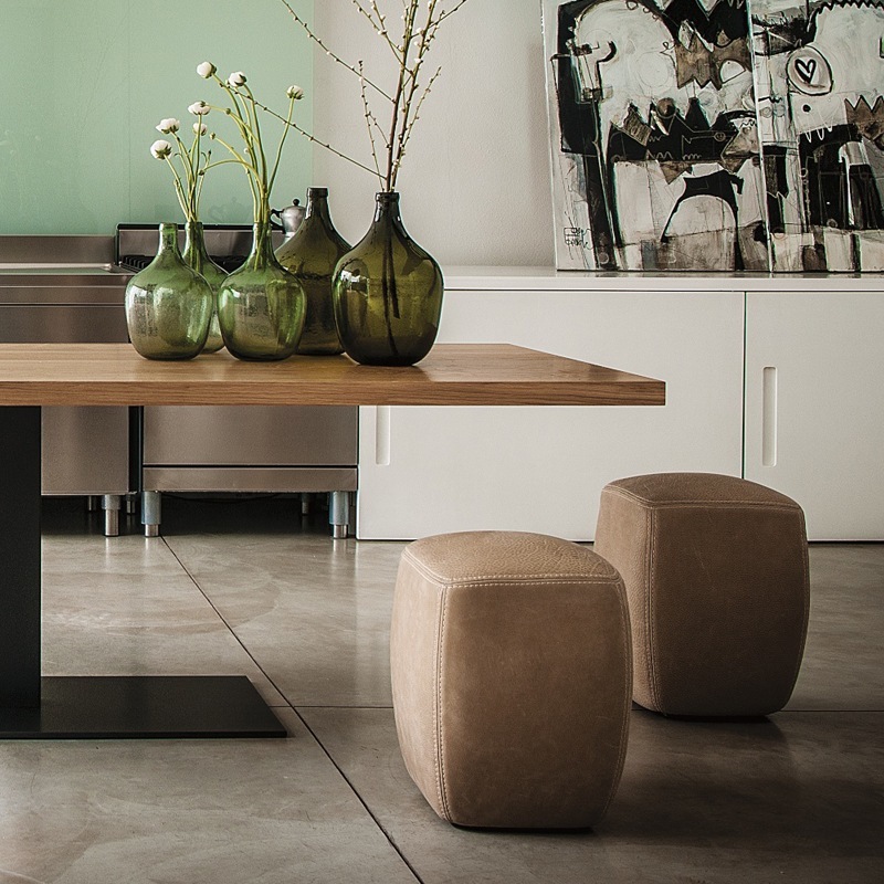 Weich gepolsterter Hocker mit handgearbeitetem Leder- oder Stoffbezug. Leder-Ausführung mit markanten Doppelnähten. Stoffbezug ist nicht abnehmbar