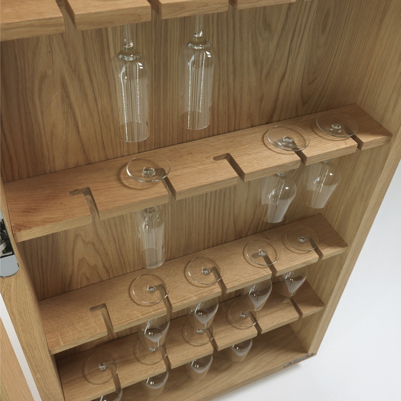 Weinschrank aus Massiv- und Furnierschichtholz mit zwei um 180° Grad drehbaren Türen. Die Innenausstattung des Schranks umfasst nebst 56 Flaschenfächern, auch 10 weitere mit verstellbaren Einlegeböden sowie je zwei mit PushPull-Schließen versehene Auszugböden und Schubladen. Die Innenseiten der Türen sind vornehmlich für die Aufnahme von Gläsern ausgelegt. Der mit automatisch einschaltenden LED-Lichtleisten ausgestattete Mittelbereich des Schranks bietet zudem die Möglichkeit, kleinere Elektrogeräte wie beispielsweise Kühlschrank oder Weinkühler zu integrieren. Die beiden unabhängig voneinander zu öffnenden Türen verfügen über massive, auf einer vertikalen Metallblende angebrachte Griffe, die in der Standardversion aus anthrazitfarben lackiertem Eisen (Irondust) gefertigt sind.