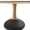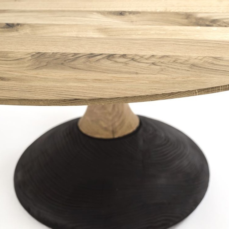 Runder Tisch mit einer Platte aus verleimten Massivholz-Leisten. Das zentrale Tischbein ist jeweils aus dem gleichen Massivholz gefertigt wie die Tischplatte und im unteren Teil verbunden mit einem Standfuß aus Zedernholz in Vulcano-Ausführung.