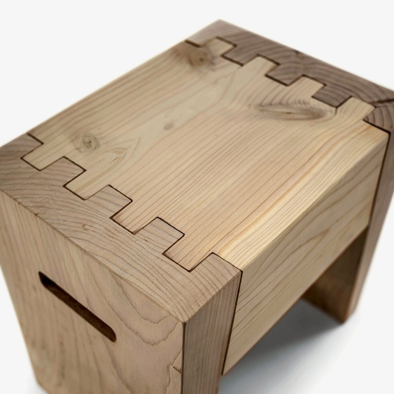 Hocker aus massivem, duftenden Zedernholz mit Schwalbenschwanzverbindung zwischen der Sitzfläche und den mit Griffmulden versehenen Seitenelementen.