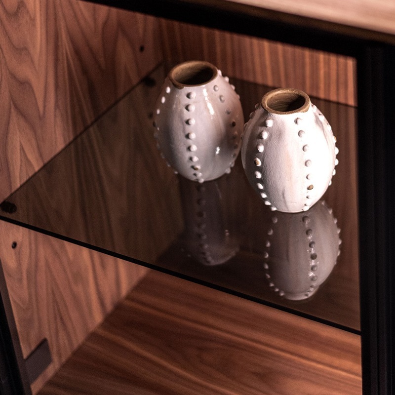 Mehrzweck-Sideboard aus Furnierschichtholz mit Türen und Einlegeboden aus Klar- oder Rauchglas, Sensor-geschalteter LED-Lichtleiste sowie optional mit zwei Vollauszug-Schubladen aus Massivholz mit Schwalbenschwanz-Verbindungen, gefräster Griffnut und Push-Pull-Öffnungssystem.