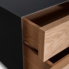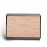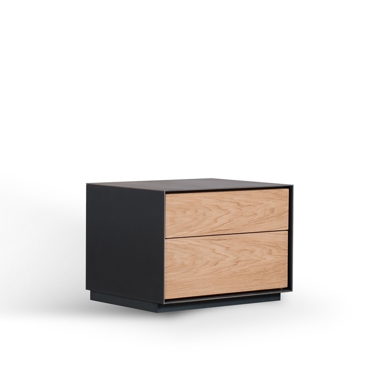 Nachttisch aus Massiv- und Furnierschichtholz inkl. zweier Vollauszug-Schubladen mit Schwalbenschwanzverbindungen und PushPull-Schließen sowie einem umlaufenden Rahmen wahlweise aus Holz oder Metall. Zur freistehenden Verwendung ist optional auch eine Rückwand erhältlich.