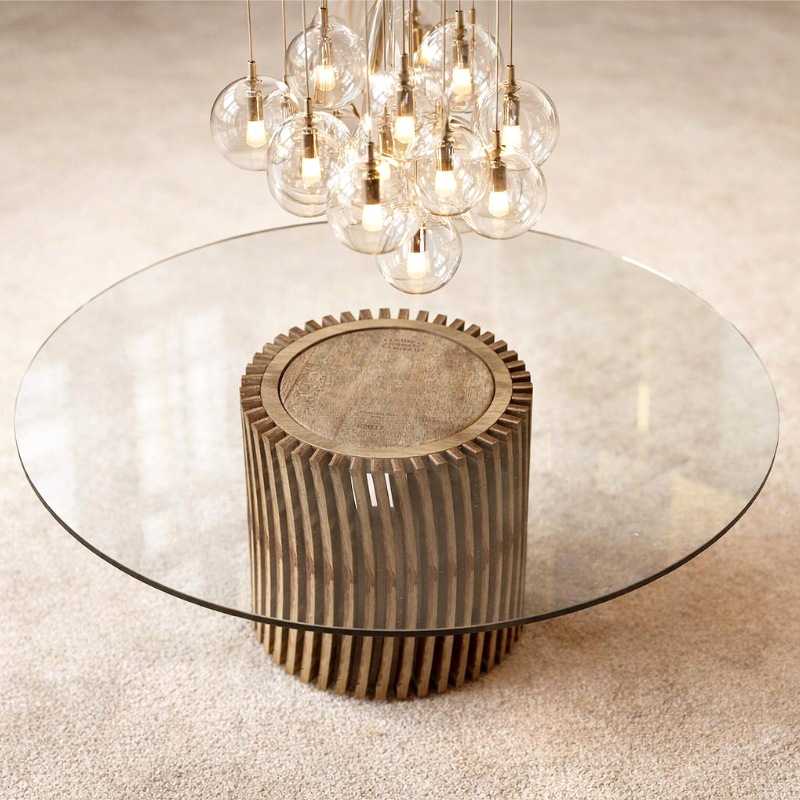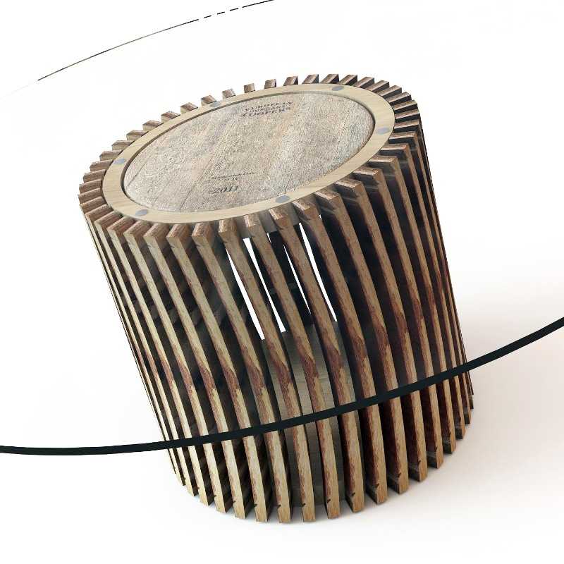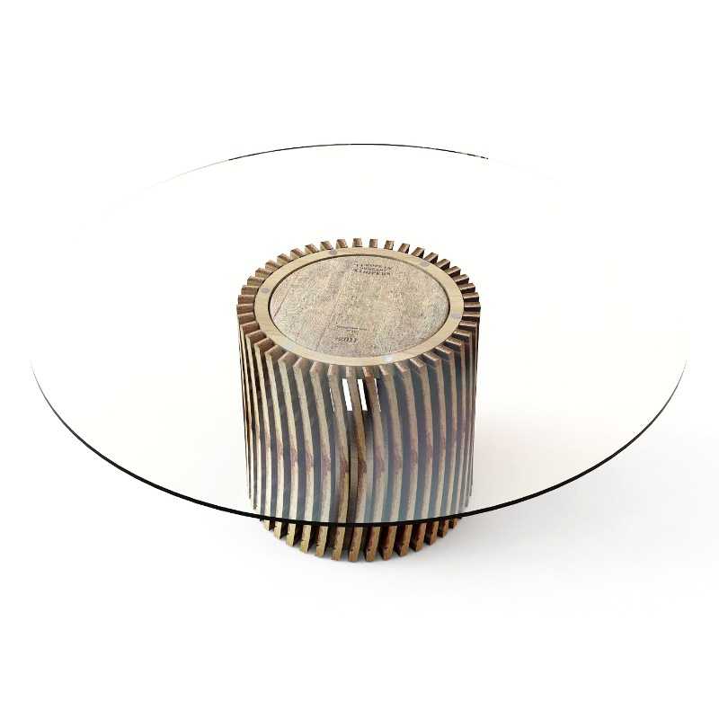 Runder Tisch mit einer 1,5 cm dicken, extra-klaren Glasplatte. Der zentrale Standsockel besteht aus profilierten, an einem runden Metallrahmen angebrachten Barrique-Eichenlatten.