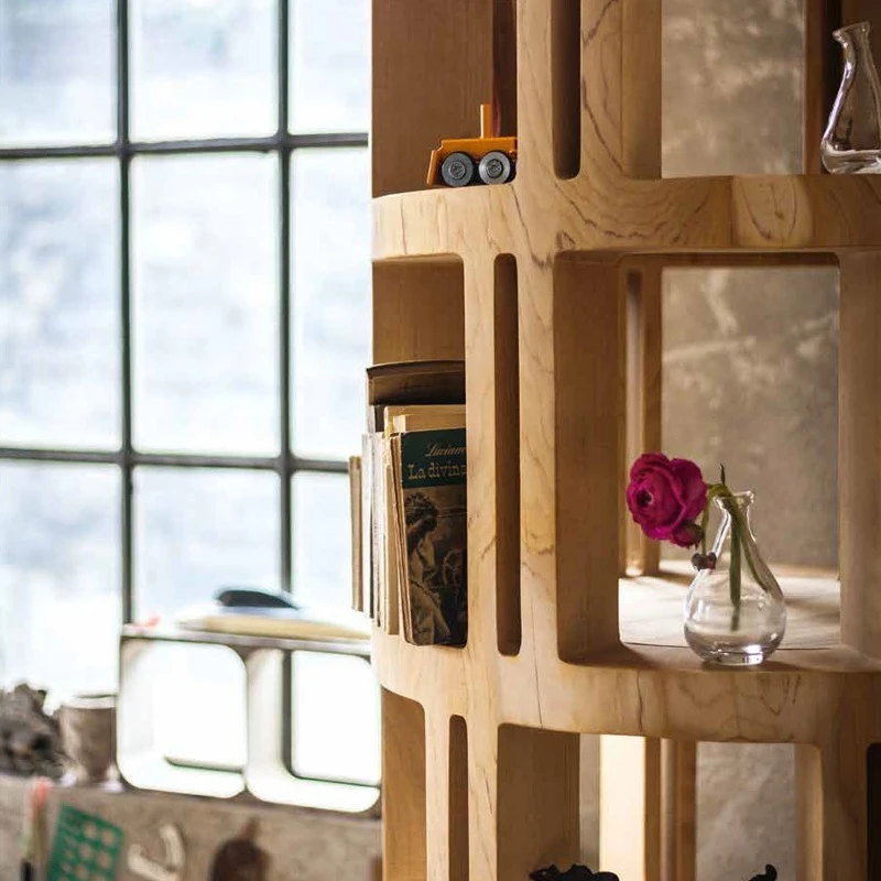 Aus einem Block duftenden Zedernholzes gefertigtes Bücherregal mit drehbarer Bodenplatte aus Eisen.
