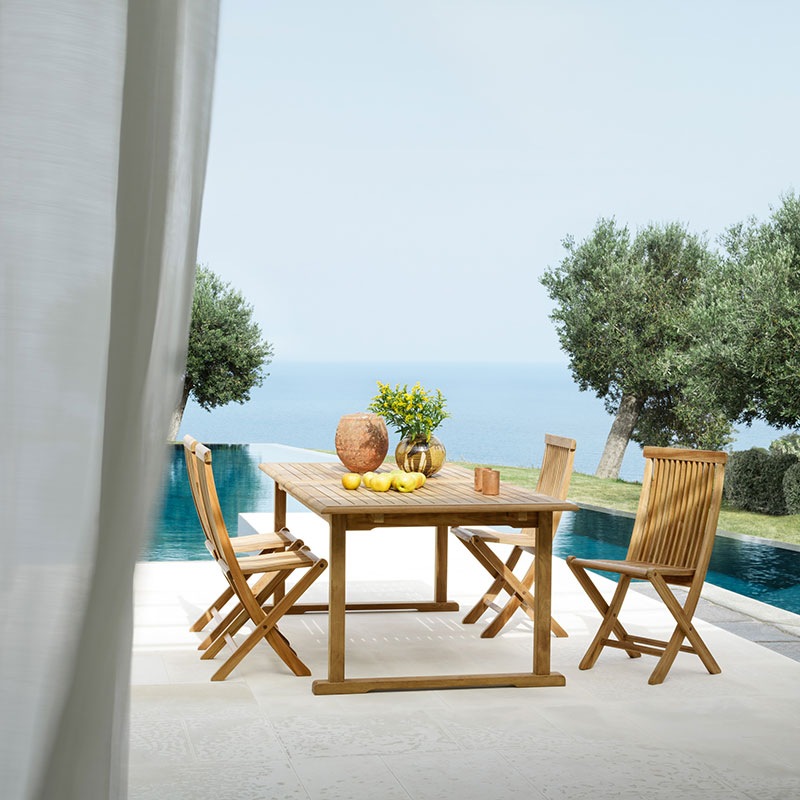 Das robuste und elegante Teakholz mit seinen warmen Farbnuancen ist ideal für die Verwendung im Outdoorbereich geeignet. Es ist von Natur aus reich an Mineralsalzen und Ölen und dadurch besonders widerstandsfähig gegen Schädlinge und Witterungseinflüsse wie Sonne, Regen und Salz.