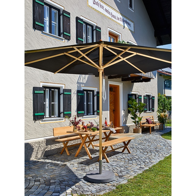 Schirmstamm und Naben Teak massiv, mehrlagig wasserfest verleimt, oberflächenimprägniert